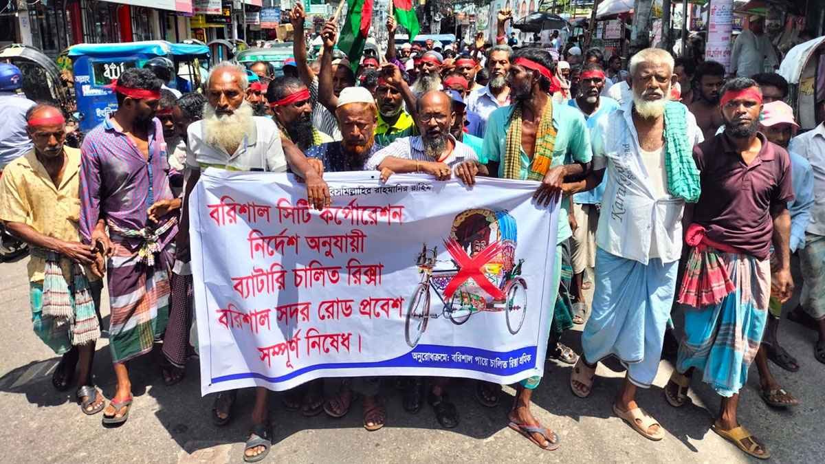 রবিবার (০৮ সেপ্টেম্বর) সকাল ১০টায় নগরীর অশ্বিনী কুমার হলের সামনে পায়ে চালিত রিকশা চালকরা মানববন্ধন করে। মানববন্ধনে তারা বলেন- পূর্বে বরিশাল সিটি করপোরেশনের নিয়মানুযায়ী নগরীর ব্যস্থতম সড়ক সদর রোডে ব্যাটারি চালিত রিকশা প্রবেশে নিষেধাজ্ঞা ছিল। বর্তমানে ব্যাটারি চালিত রিকশা চালকরা সে নিয়ম ভঙ্গ করে সদর রোডে ব্যাটারি চালিত রিকশা চালাচ্ছে।